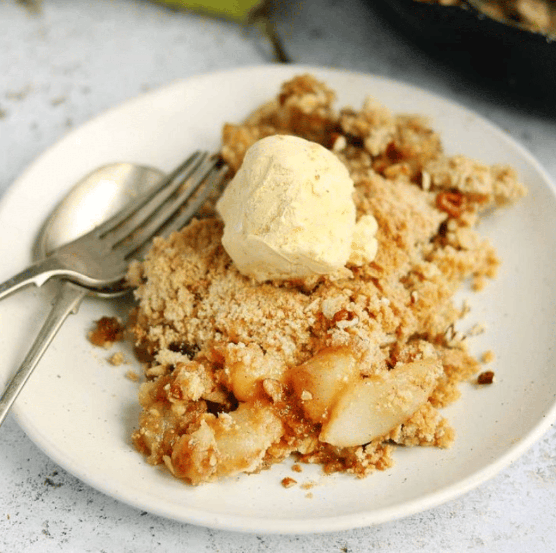 If a sweet dessert with a bit of a spice kick is your vibe, this is the one for you. Think butter, cinnamon, sugar, pears, and vanilla ice cream to top it all off.