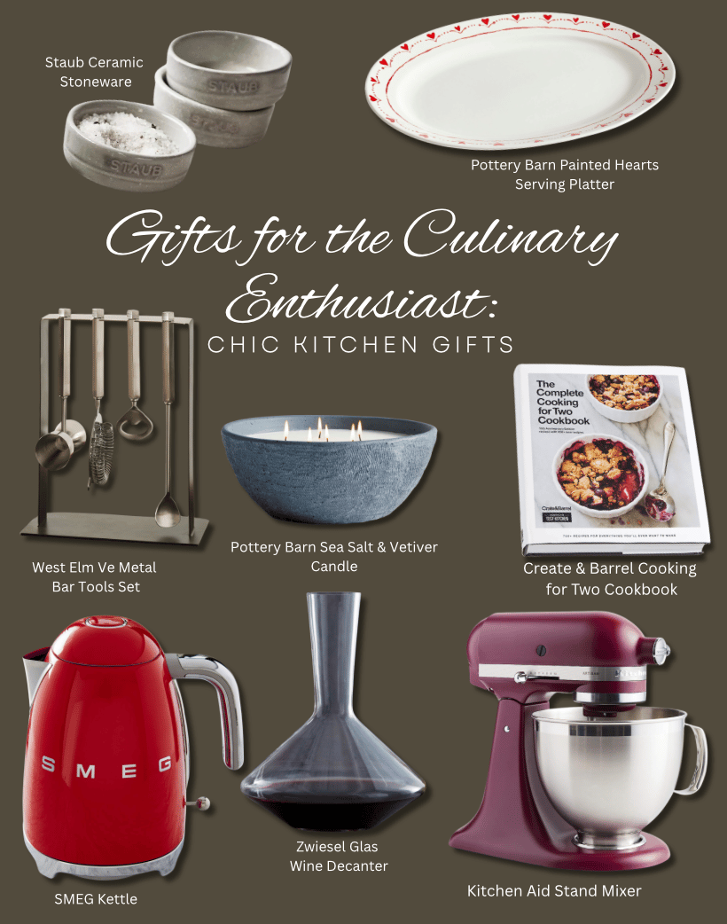 Staub ceramic stoneware dishes, Pottery Barn painted hearts serving platter, West Elm bar tools set, Pottery Barn sea salt & vetiver candle, Crate & Barrel cookbook, SMEG kettle, Zwiesel Glass wine decanter, Kitchen Aid stand mixer